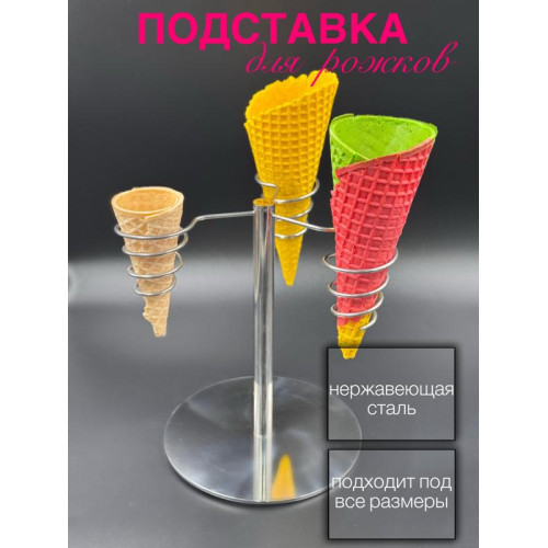 Стальная подставка для рожков под мороженое не только удобна в применении, но и конструкционно привлекательна - ее с успехом можно использовать, как украшение прилавка.
